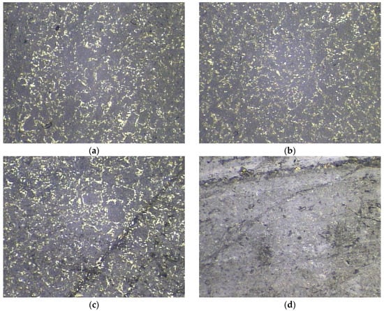 Surface appearance of the auxiliary sealing surface of the floating-ring test piece. (a) The air-inlet direction is the same as the spindle-rotation direction primary floating ring; (b) the air-inlet direction is the same as the spindle-rotation direction secondary floating ring; (c) the air-inlet direction is opposite to the spindle-rotation direction primary floating ring; (d) the air-inlet direction is opposite to the spindle-rotation direction secondary floating ring.