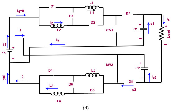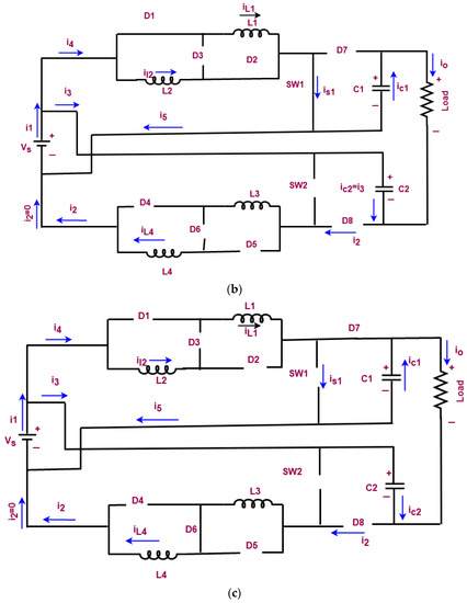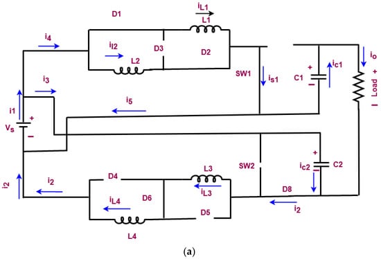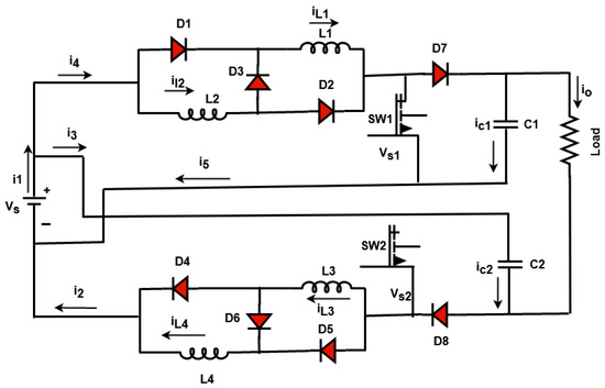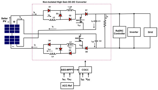 In this work, a non-isolated high voltage gain DC-DC converter has been used to properly regulate the output voltage of PV, because the PV output is naturally unregulated. It may disrupt the overall performance and efficiency of the grid system. Hence, it must be properly regulated and boosted for obtaining the maximum output voltage. Thus, the proposed work aims to utilize an advanced non-isolated high voltage gain DC-DC converter for voltage regulation and boosting. This type of converter is more suitable for large-scale applications since it highly improves the voltage with minimal loss factor. Moreover, it can operate with the reasonable duty cycle, and it incorporates the switched inductor structure with the dual boost topology. When compared to the other DC-DC converters, it has the key benefits of reduced switching stress, switching loss, high voltage gain, and efficiency. To improve the performance of converter, a novel COCC is implemented in this work, which generates the controlling pulses for operating the switching components of the converter. The circuit representation of the non-isolated high gain DC-DC converter is shown in Figure 4, and its modes of operation are represented in Figure 5a–d. During mode 1, the switch SW 1 is in on state, SW 2 is in off state, the diodes D1, D2, D6, and D8 are forward biased, and D3, D4, D5, and D7 are reverse biased. In mode 2, the switches are in the same state, but the diodes D1 and D2 are forward biased, and D3–D8 are reverse biased. During mode 3, both switches are in off state, diodes D1, D2, D4, and D5 are reverse biased, and D3, D6, D7, and D8 are forward biased. Finally, the switches SW 1 is in off state, and SW 2 is in on state during mode 4; diodes D4 and D5 are forward biased, while D1, D2, D3, D6, D7, and D8 are reverse biased.