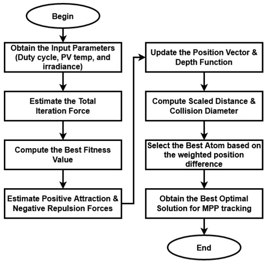 | Input: Initialize Duty cycle DC, cell temperature PVT, solar irradiance SG; Output: Optimal solution; Procedure: Step 1: The total interaction forces acting on the jth atom in mth dimension as shown in Equation (1); Step 2: To make algorithm more exploitation at final iteration, each atom needs to interact as few atoms with better fitness values as computed in Equation (2) Step 3: The interaction force is the gradient of Lennard-Jones (L-J) potential, the revised version of this model with positive attraction and negative repulsion forces as represented in Equation (3) Step 4: The depth function is computed by using Equation (5); Step 5: The scaled distance is estimated between two atoms as shown in Equation (6); Step 6: The relation between the solar panel voltage and duty cycle is estimated by using Equation (7); Step 5: The length scale α(t) is estimated using Equation (8); Step 6: The resulting geometric constraint force is computed using Equation (9); Step 7: The acceleration of the jth atom in mth dimension at iteration t is calculated as represented in Equation (10); Step 8: The relation between the PV current and voltage is estimated as shown in Equation (12); Step 9: Finally, the optimal solution of voltage and current is estimated to obtain the power as represented in Equation (17); |