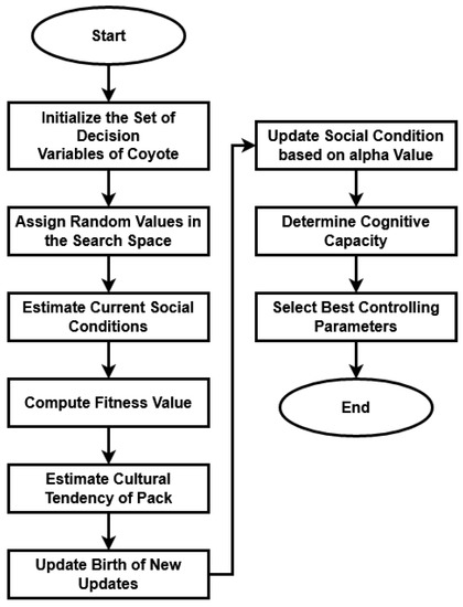 The main purpose of implementing this controlling algorithm is to obtain an increased output voltage with reduced switching losses and frequency. The proposed COCC is developed based on the coyote optimization technique, which returns the best solution for the optimal selection of parameters ,, and . This helps to generate the controlling pulses for operating the switching components of the DC-DC converter. In this controlling algorithm, the PV output voltage, error signal, and sampling time are taken as the inputs, and the optimal selection of parameters is produced as the output. Figure 6 shows the working flow of the CO algorithm.
