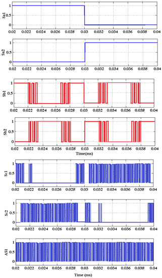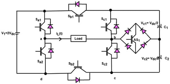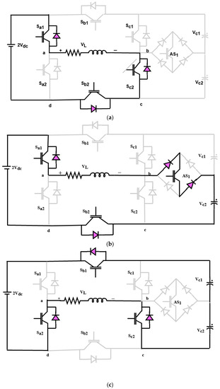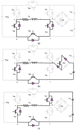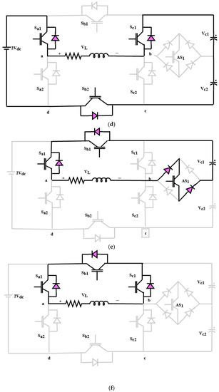 The equivalent circuit model of the proposed nine-level inverter topology is shown in Figure 7, and its modes of operation are illustrated in Figure 8a–d. Moreover, the switching states with charging C, discharging DC, and no effect NE models are illustrated in Table 1. As shown in this model, the switches Sb1 and Sb2 are complementary to the switches Sa1 and Sa2 in all states of switching. In most of the states, the switches Sc1 and Sc2 are complementary to each other, excluding the states of S2, S5, S8, and S11. So, consider the switches Sai, Sbi, Sci (i.e., i = 1, 2), and their switching functions AS1 are computed by using the following equations: