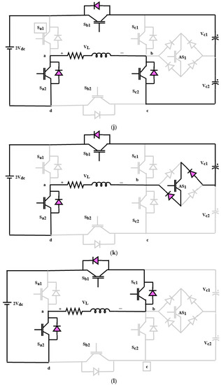 Switching states of nine-level inverter. (a). State 1, (b). State 2, (c). State 3, (d). State 4, (e). State 5, (f). State 6, (g). State 7, (h). State 8, (i). State 9, (j). State 10, (k). State 11, and (l). State 12.