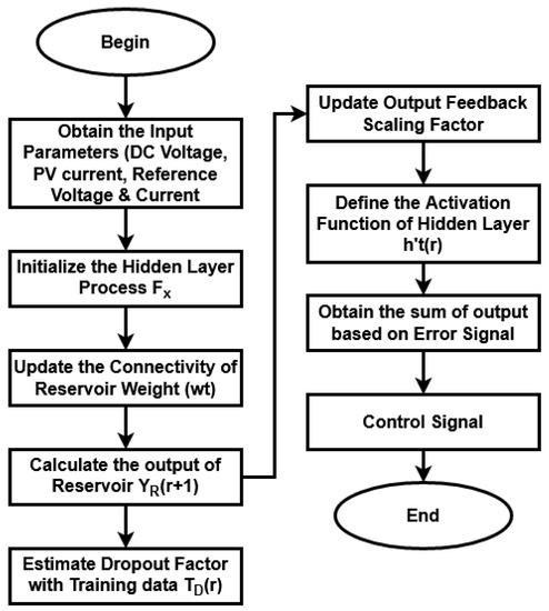 | Input: DC voltage VDC, PV current IPV, reference voltage VRef and reference current IRef; Output: Control signal; Procedure: Step 1: The dynamic echo state hidden network process is performed by using Equations (40) and (41); Step 2: Then, the connectivity of reservoir weight is formulated with respect to weight matrix as shown in Equation (42); Step 3: The output of reservoir is estimated by using Equation (43): Step 4: Estimate the dropout factor by randomly selecting the neurons for training by using Equation (44); Step 5: Output feedback scaling is updated with forward pass as shown in Equation (45); Step 6: Define the activation function for the hidden layer by using Equation (46); Step 7: The squares’ sum of output is called as the error signal, which is estimated by using Equation (47); Step 8: Return the control signal parameter as the output Pd; |