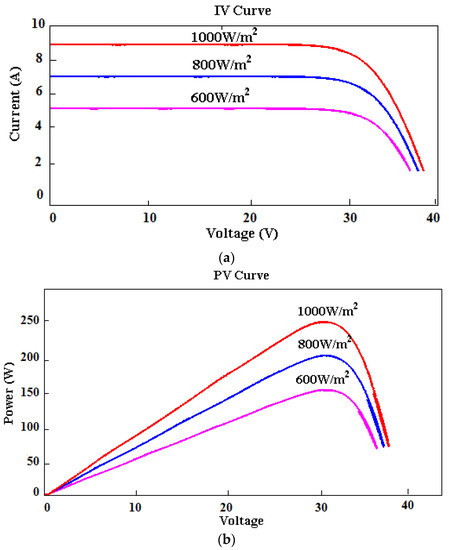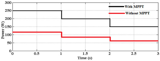 This section presents the simulation and comparative analysis of the proposed controlling techniques used for improving the power quality and reactive compensation capability of the grid-PV systems. To examine the results of MPPT controlling, converter, and inverter topologies, the MATLAB/SIMULNK tool was used in this work. The novel contribution of this work is to implement advanced controlling mechanisms for resolving the power quality problems in the grid-PV systems. Here, the ASO based MPPT controlling mechanism is used to obtain the maximum energy yield from the PV panels. Figure 10a,b validates the IV and PV characteristics of the proposed ASO-MPPT mechanism with respect to varying temperature and irradiation conditions. Typically, the IV and PV characteristics are mainly estimated to analyze the power tracking efficiency of the MPPT controller. According to the results, it is analyzed that the proposed ASO-MPPT controller obtains the maximum possible energy yield from the PV panels by accurately identifying the MPP. Then, Figure 11 estimates the output power of PV with and without MPPT controlling techniques, where the results are estimated with respect to varying time instances. The estimated results indicate that the output power with MPPT is highly improved, when compared to the output without MPPT. Due to the proper tracking of MPP using an ASO algorithm, increased output power is obtained from the PV panels.