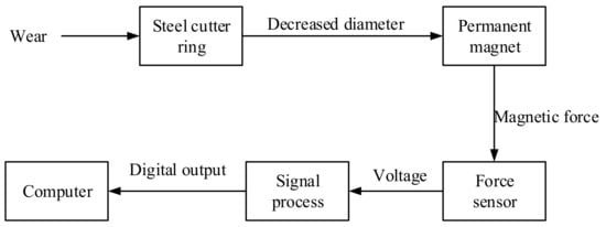 The working principle of the detection system for cutter wear using magnetic force is explained by a step-by-step block diagram, as shown in Figure 1. Firstly, the wear makes the diameter of the steel cutter ring decrease. As a result, the volume of steel in front of the permanent magnet is reduced, which makes the magnetic force between the permanent magnet and steel cutter ring decrease. Then, a high-precision force sensor is employed to detect the decreased magnetic force. The output voltage of the force sensor is transformed into the signal processor board to complete the amplification, noise filtering, and analog-digital conversion. Finally, the digital output signal is transformed into a computer for recording.