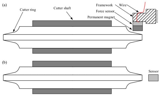 The architecture of the detecting system adopted in this work is shown in Figure 2a. There exist a permanent magnet, a force sensor, and a framework in the detecting system. The permanent magnet and force sensor are fixed together by adhesives to ensure the force sensor can respond to the magnetic force quickly. In current research [20,21,22,23,24,25,26,27], the sensor for cutter wear is commonly located in front of the cutter ring to detect the distance variation induced by the wear, as shown in Figure 2b. However, this commonly used scheme is given up in this work because the relationship between the magnetic force and distance from the steel to a magnet is highly nonlinear [30]. This nonlinearity makes the sensitivity of the magnetic force to the wear become very low when the wear is considerable.