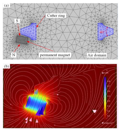 The magnetic field between the cutter ring and the permanent magnet is simulated by the Magnetostatics module in the commercial finite element software of COMSOL Multiphysics 6.0 [31]. The simulation result of the magnetic field is shown in Figure 3b. The color in Figure 3b represents magnetic flux density, and the darker the color, the higher the magnetic flux density. The magnetic force between the permanent magnet and cutter ring is calculated through the built-in Force Calculation function of the Magnetostatics module in COMSOL Multiphysics 6.0.