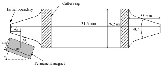 To describe the wear, an annulus cuts off a portion of the cutter from the outer boundary by Boolean operation. In this work, the location of the permanent magnet is represented by the lateral distance from the permanent magnet’s center to the initial boundary of the cutter ring (dm), and the normal distance from the permanent magnet’s surface to the cutter ring’ surface (ds). The inclination of the permanent magnet represents the orientation (θ), as shown in Figure 4.