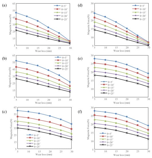 The relationships between the magnetic forces and wear losses obtained from the finite element simulation are shown in Figure 5. To investigate the effect of the permanent magnet’s placement on magnetic forces, the lateral distance (dm) varies from 0 mm to 15 mm, the normal distance (ds) varies from 10 mm to 15 mm, and the orientation (θ) varies from 5° to 20°. According to practical engineering experience, the limit of wear is commonly 25~30 mm, so the wear loss increases from 5 mm to 30 mm with a step of 5 mm.