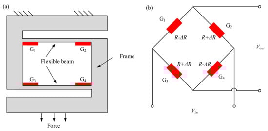 Principle of the force sensor: (a) schematic diagram of the structure; (b) Wheatstone bridge.
