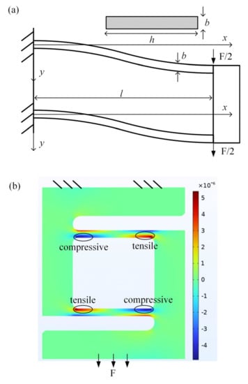 To explain how the force applied on the sensor is converted into the strains, coordinate systems for the two beams are established, wherein the x-axis is along the mid-plane of the beams, as shown in Figure 7a. According to the Euler–Bernoulli beam theory [33], the governing equation and boundary conditions of beams are expressed as