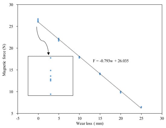 The testing relationship between the wear loss and the magnetic force is shown in Figure 10. The inner box is the local zoom of the data points corresponding to the wear loss of 0 mm. It can be seen that there are eight data points corresponding to every wear loss because the cutter is measured eight times with directions of 0°, 45°, 90°, 135°, 180°, 225°, 270°, and 315°. The measured force is lower than the simulated one shown in Figure 5a. This is because there exists an attraction between the steel frame of the force sensors and the permanent magnet. This attraction compensates for a portion of the magnetic force between the cutter ring and the permanent magnet.