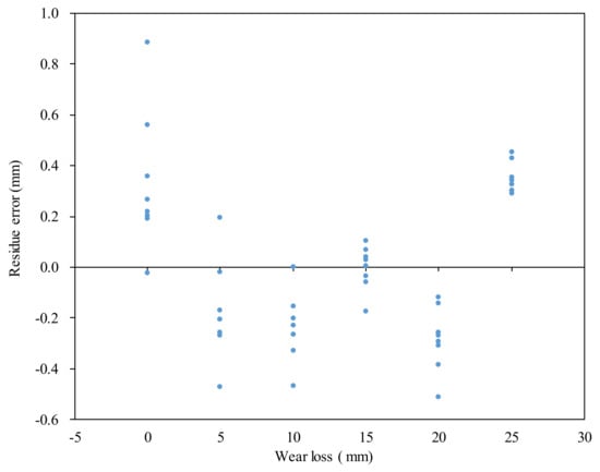 The computed residue errors are shown in Figure 11. There are also eight data points corresponding to every wear loss because the cutter is measured in eight directions. It can be seen that the maximal residue error is lower than 1 mm. In other words, the accuracy of the linear wear-detecting method proposed in this work approaches 1 mm, which is of the same order of magnitude as those obtained in [13,21]. The accuracy of 1 mm is sufficient for decision making regarding changing the disc cutter of TBM because the deviation of 1 mm has little effect on boring efficiency.