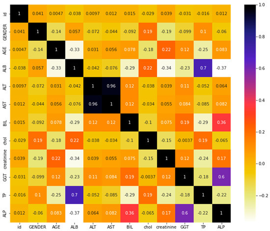 Our study calculated the correlation coefficients between different features using Pearson’s method. Pearson’s correlation coefficient is a commonly used method to measure the linear correlation between two variables, with values ranging from −1 to 1, where 1 indicates a perfect positive correlation, 0 indicates no correlation, and −1 indicates a perfect negative correlation. It measures the strength of the relationship and the direction of the relationship between two variables. In the HCV dataset, the correlation between features can provide insight into the relationship between various factors that influence HCV infection and its progression. For example, the correlation between age and HCV infection rate can help us understand if older individuals are more susceptible to HCV infection.