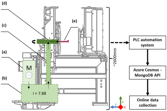 Figure 1. The peripheral milling process’s main physical components are (a) AC electric motor, (b) gearbox, (c) shaft, (d) spindle, and (e) milling position (x-axis direction feed). The data flow to the internet-connected data collection system is connected through the integrated PLC system and Azure Cosmos MongoDB API.