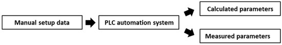 The data acquisition setup was established to contain collectable data from four categories: manual setup data, PLC automation system, calculated parameters, and measured parameters, with the number of collected parameters 7, 8, 18, and 6, respectively. The manufacturing sequence and data acquisition flow began with manual setup data input specified by the machine operator as illustrated in Figure 2. This manual input engaged predetermined machine configurations in the PLC automation system and activated the milling process. Some of the collected parameters were calculated based on the previous input, and the remainder by other measurements connected to the PLC.