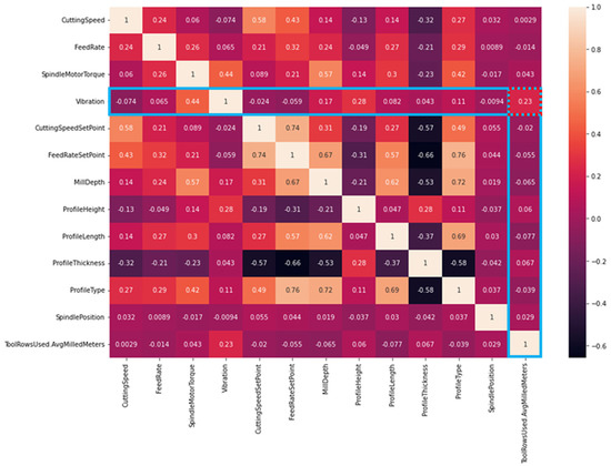As a result, the PCC scores for high correlation remained lower, as presented in the earlier research. Despite the iterative feature reduction, the data remained rather high in dimensionality (13 features), which likely resulted in lower scoring in comparison with less complex correlation maps where more obvious connection features might exist. The top three features correlating with the ‘Vibration’ are: ‘SpindleMotorTorque’ (0.44), ‘ProfileHeight’ (0.28), and ‘ToolRowsUsed.AvgMilledMeters’ (0.23). The highest value, ‘SpindleMotorTorque’, is evident due to physical consequences in increasing/decreasing torque affecting the vibration amplitudes in the cutting phenomenon. The correlation in the ‘ProfileHeight’ and other cutting material size properties also remain positive (+) due to similar justification, where the material physical features affect operational cutting forces and vibration amplitudes. The highest correlation to the cumulative usage of the milling blades (‘ToolRowsUsed.AvgMilledMeters’) is with the ‘Vibration’ parameter highlighted in the figure, with a correlation value of 0.23.