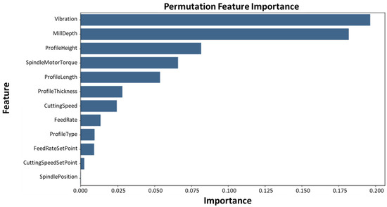 Given the conditions determined in Figure 4, the permutation feature importance results in Figure 5 indicate that the ‘Vibration’ feature had the most significant correlation to ‘Operational’ and ‘Blade change’ conditions. Similarly with the PCC results, the PFI scoring levels remain low, yet illustrating the main feature of ‘Vibration’ being the dominant of the features in correlation to cumulative milling distance performed by the peripheral milling machine. The feature ‘MillDepth’ existed as a second important feature due to the variating milling recipes driven during the two datasets.