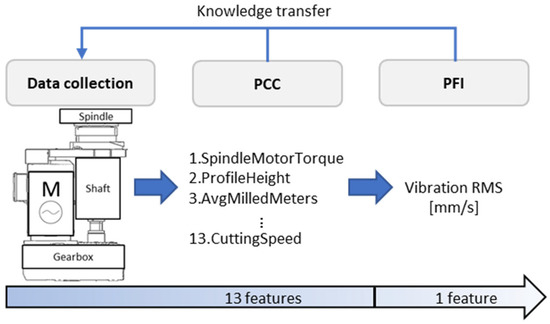 To conclude, the feature correlation methods of PCC and PFI gave a robust base for selecting the ‘Vibration’ feature to be dominant concerning the recognised linear wear behaviour occurring over accumulating milling time. The pipeline from the start point with the original dataset to the dominant feature selection is illustrated in Figure 6. The knowledge received from this process can be transferred back to the data collection setup, such as by increasing the number of vibration measurement sensors in different physical directions and/or frequency ranges to enable more comprehensive data and to receive a better understanding of the operation versus wear behaviour phenomenon.