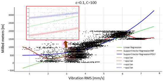 The hyperplane fitting is visually illustrated in Figure 7. The illustration presents one (1) peripheral milling machine operational cycle, where the operational milling distance was 2003.43 m. Upper (+) and lower (−) epsilon boundaries are illustrated with a dashed rectangle on top of the SVR-related hyperplanes in Figure 7, where the hyperplane fitting is performed with ε = 0.1, C = 100. The SVR hyperplane fitting towards the milling cycle data was also tested with several other manually selected hyperparameters; however, the ε = 0.1, C = 100 selection resulted in the most accurate hyperplane fitting.
