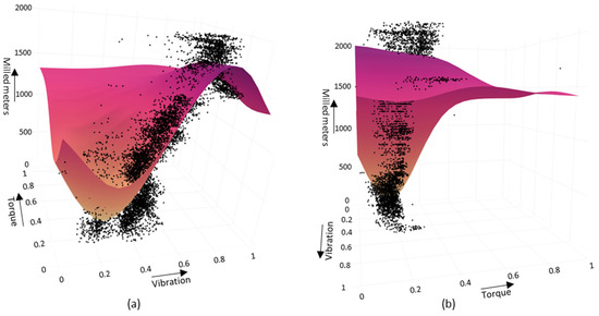 The dataset was normalised with the MinMaxScaler function to rescale the targeted parameters ‘Vibration’, and ‘SpindleMotorTorque’ to ‘Vibration (scaled)’, and ‘SpindleMotorTorque (scaled)’ by using the scale of zero…one, respectively. The feature scaling operation normalised the value ranges of independent variables [46], allowing comparing feature values that normally operate on different value scales. Figure 8a illustrates a better viewpoint for the cumulative effect on ‘Vibration (scaled)’, and Figure 8b for the ‘SpindleMotorTorque (scaled). The visual observation of the feature space in Figure 8a illustrates the clear connection between the cumulative milling meters and increased vibration behaviour. The operational milling recipe changes during the milling cycle falsified the curvature of the hyperplane to point downwards towards the end of the milling cycle. Figure 8b illustrates that the torque dimension was moderately spreading towards the end of the milling cycle (milled meters). This observation supports the PCC and PFI results, indicating that the parameter affects the correlation between torque value and the cumulative milling process.