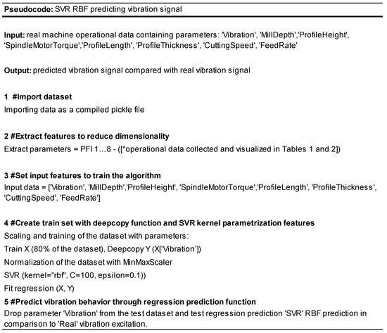 In this section, the SVR is utilised to predict the vibration signal based on the selected inputs. The kernel parameters used (RBF; ε = 0.1, C = 100) were justified in the earlier sections of this research. The presented pseudocode in Figure 9 was initiated to describe the main principles of the SVR algorithm. The main steps in the code are numbered between one and five, starting from the dataset import function, with the eight most important features selected from the PFI phase. After importing the complete dataset, the selected features were extracted from the raw data in step two and set as algorithm training features in step three. Then, the pseudocode description stated to split the given data into train and test splits and to rescale all the feature input values between zero and one, as determined in step four. The SVR algorithm predicted the dependent variable by identifying a hyperplane in a high-dimensional feature space that had the maximum margin of separation from the data classes [23]. The hyperplane was chosen such that it passed through as many data points as possible, and the distance between the hyperplane and the closest data points, called support vectors, was minimised [27]. In SVR, the correlation between the independent and dependent variables is described by a deterministic function in [21,24,27]: