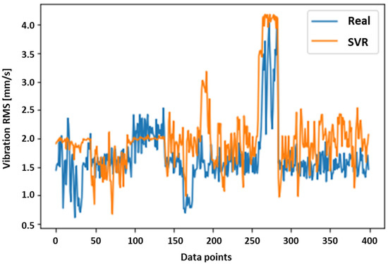 The graphical representation of the SVR RBF’s ability to predict the machine ‘Vibration’ trend is displayed in Figure 10. The SVR trend behaviour in the figure presents four hundred (400) vibration data points formulated based on the input data presented in pseudocode step three. Due to the collection frequency of 5 Hz during the data collection, the visualised 400 data points correspond to approximately 1.3 min of the milling operation.
