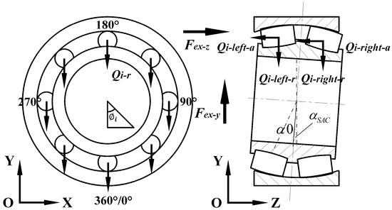 Figure 3 also reveals that the sum of the inner-ring displacement and the distance between the ith roller and the inner ring equals that of the outer-ring center and the ith roller, which can be decomposed in the X, Y, and Z directions and expressed as