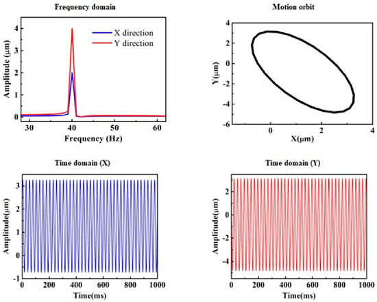 This section examines the dynamic characterization of SRBs with self-aligning functions under low-speed and heavy-load operating conditions. Referring to the bearing manual, it is assumed that the rotating speed is 1200 rpm and the external loads are 12 kN, 18 kN, and 0.15 kN in the X, Y, and Z directions, respectively. In light of the bearing manual, the maximum equivalent load and the rated speed of this type of bearing are 190 kN and 3400 rpm, respectively.