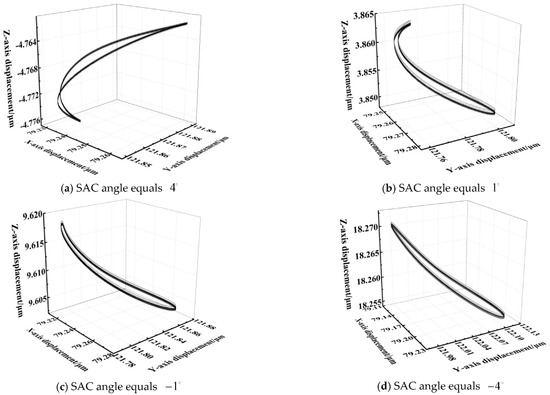 Figure 15 shows how the motion orbit of the inner ring varies with different SAC angles. The motion orbit is distorted by degrees if the SAC angle is positive, indicating that the inner ring is rotating clockwise relative to the outer ring. The larger the SAC angle is, the more obvious the distortion is. On the contrary, when the SAC angle is negative, the motion orbit is stretched.