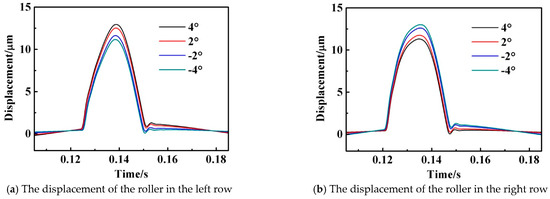 Figure 14a,b highlights that the normal displacement of the roller changes regularly during its revolution period. When the roller enters the loading region, its normal displacement increases gradually and then decreases, which means the loading mission begins from secondary loading to primary loading and then to secondary loading. On the contrary, the roller displacement oscillates slightly in the non-loading region.