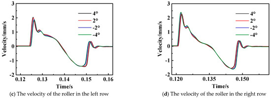 The dynamic characteristics of the inner ring are determined by the unbalanced loading of all the rollers due to the SRB’s self-aligning function. So it is different for the amplitudes of the rollers in the left and right rows, which show a characteristic of “one loss but the other gain”, as illustrated in Figure 17a,b. Because of an axial load from left to right, the load on the SRBs roller in the right row is larger than that in the left row, whereby the normal vibration of the right-row roller has a larger span in the time domain. Correspondingly, the vibration speed of the right-row roller entering or leaving the loaded region is slightly greater than that of the left-row roller, as revealed in Figure 17c,d. Particularly in the entering or leaving period, the vibration speeds will oscillate slightly and then recover gradually for both the left and right rollers. The oscillating behavior is also the reason for some additional frequencies. It is noted that because of the staggered roller distribution, the two rollers in different rows do not enter the loaded region synchronously.