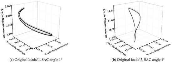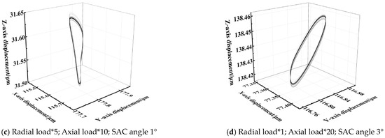 Figure 18a indicates the motion orbit of the inner ring is steady with a light load despite the self-aligning operating condition. When the external load is increased to 5 times the original value, namely the heavy-load condition, the motion orbit is distorted and looks like an “8” shape, as shown in Figure 18b. A steady orbit is derived from the constant value of the external load, but the larger magnitude and the unreasonable combination of the radial and axial loads contribute to a distorted motion orbit. Figure 18c shows that a proper axial load can improve SRBs’ service performance, which is theoretically suitable for nearly all kinds of radial rolling bearings. In the case of Figure 18d, even if the SAC angle is close to the limit, a larger axial load improves the motion orbit of the inner ring significantly.