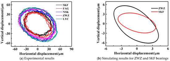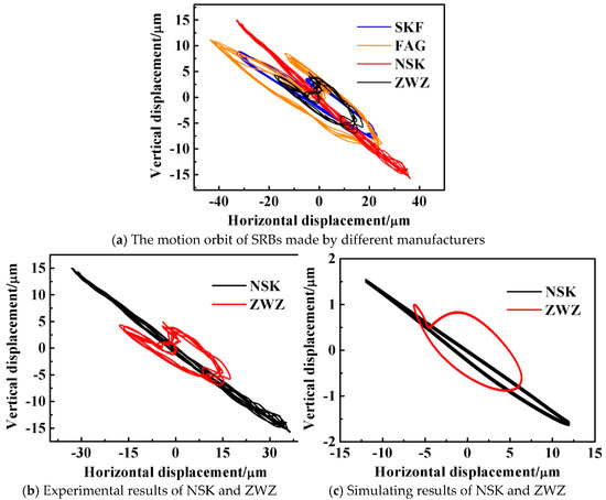 Figure 23a reveals the motion orbits of SRBs from different manufacturers under the limiting self-aligning operating condition. Particularly, the SAC angle is limited to 4 degrees. The motion orbits of all the bearings are distorted to different degrees with a larger SAC angle, which is the same as the simulated results shown in the comparison of Figure 23b,c. At this moment, a limitation is regarded as a constraint, so the magnitude of the motion orbit in Figure 23 is obviously smaller than that in Figure 21.