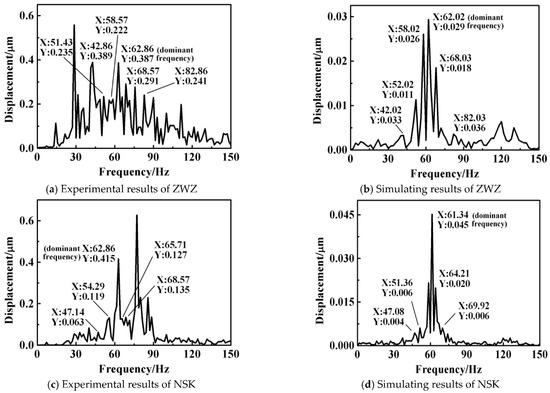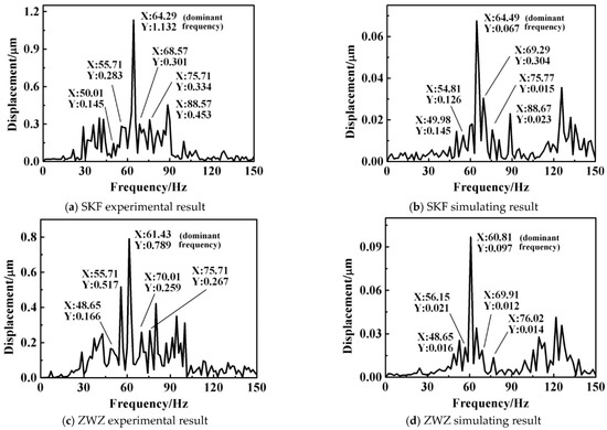 Figure 22 shows the displacement vibration spectrum of SRBs. By comparing Figure 22a with Figure 22b as well as Figure 22c with Figure 22d, not only the dominant frequency (namely the times of the roller passing through a certain point of the outer-ring raceway), but also the additional frequencies due to self-aligning function can be coincided both theoretically and experimentally. The values of the dominant and additional frequencies correspond to the description of Equation (51).