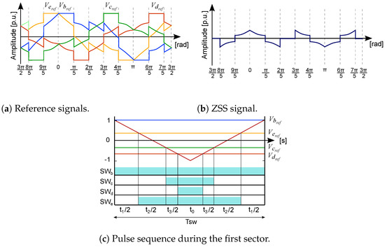 In addition to improving the efficiency of the converter, the HD-PWM scheme intends to equally distribute the switching losses between the semiconductors. To that end, all switches must be clamped for the same amount of time. Based on the well-known three-phase D-PWM1 [27], the HD-PWM scheme clamps the reference signal with the highest absolute amplitude to the positive or to the negative DC bus. Nonetheless, due to the reference signal symmetry (1), two reference signals satisfy the highest absolute amplitude condition. Therefore, the clamping time must be divided between these two reference signals in order to distribute the clamping time between the upper and lower semiconductor. However, the upper clamping time is shorter than the lower clamping time for phases b and d, while phases c and e have longer upper clamping times. The clamping time mismatch is small though and represents 5% of the fundamental period. Nevertheless, this unbalance can be avoided by reducing the largest clamping time by including additional sectors where no ZSS is injected (sectors 3 and 8 in Figure 2b). Likewise, the reference signals of the HD-PWM are defined as: