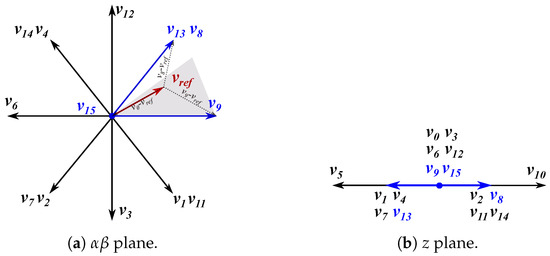 When a fault occurs, the vector space no longer consists of the two subplanes ( and ) typical of five-phase converters. The vector space after a fault is defined by (3), resulting in an subplane and a z homopolar component (Figure 5). Similarly, Figure 5a shows the vector selection when lies in sector 1. As can be seen, two redundant vectors are chosen ( and ). In this way, the vector applied to the homopolar component z is, on average, zero (Figure 5b).