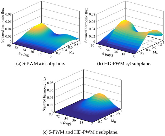 In order to compare the HD-PWM with the reference modulation, S-PWM, Figure 6 shows the squared harmonic flux of the S-PWM and HD-PWM schemes in the and z subplanes. As a sinusoidal output voltage is desired, the z subplane voltage reference is zero. Thus, only active vectors affect the squared harmonic flux in the z subplane. For that reason, as active vector application times does not vary between analysed modulation techniques, the z subplane squared harmonic flux is equal in all presented modulation algorithms (Figure 6c). As expected, the S-PWM presents a lower output current distortion, mainly due to the clamping times applied in discontinuous algorithms. In addition, the squared harmonic flux is larger near due to the vector’s highest amplitude of and, as a consequence, the introduced error voltage is larger. In this context, the HD-PWM shows a good harmonic performance when is near since the S-PWM scheme is applied in that sector. Lastly, the squared harmonic flux achieves its maximum for a medium modulation index in the subplane. On the other hand, the squared harmonic flux increases with the modulation index in the z subplane since it only depends on the active vector application time.