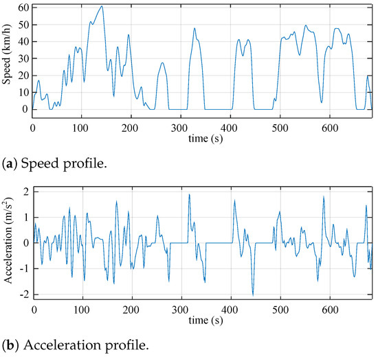 In this section, a switching losses analysis, where a homogeneous temperature distribution was assumed for all IGBTs, was carried out by simulation. To that end, modulation techniques were validated on the mathematical model of an electric vehicle, fully described in [30]. This simulation platform incorporated, in addition to the power and control electronics model of the vehicle, the acceleration/braking and speed profiles of the driving cycles. In fact, the use of these profiles has been proven to be very useful to check the performance of the propulsion system in conditions close to the real situation [31]. For electric vehicles, the use of specially designed cycles is recommended. Thus, in this work, the Fleet-BEV’s urban cycle (Figure 8), obtained from the data of several electric vehicles, was implemented. For simulation purposes, an Infineon IKY75N120CH3 IGBT module was modelled in Matlab/Simulink to estimate its losses. However, since conduction losses do not depend on the modulation strategy, they were not further analysed.