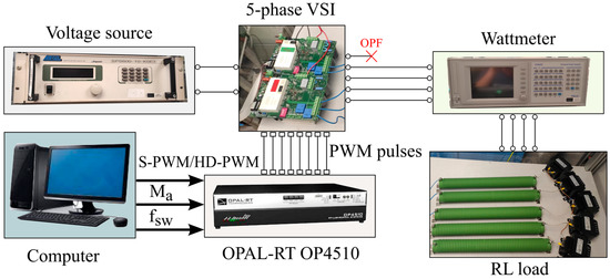 To validate the proposed HD-PWM algorithm, the experimental setup shown in Figure 10 was built, which included a DC voltage source, a controller board (OPAL-RT OP4510), a driver board, a five-phase power converter, and a balanced RL load. Indeed, RL loads have been shown to be useful for validating the performance of modulation techniques at different operating points [32].