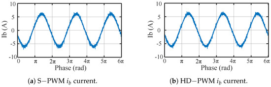 On the other hand, the harmonic performance of the modulation techniques was analysed. For that purpose, each PWM technique’s b-phase current was measured with the Tektronix DPO 7045C digital oscilloscope under the static operation point of = 18 kHz, = 250 V, and = 0.85. To that end, Figure 12 shows the b-phase currents of each modulation and low-order harmonics amplitude are summarised in Table 2. As expected, the S-PWM had the lower THD (1.52%) and in the two techniques, the third harmonic was the most prominent one due to the control loss of the third harmonic subplane. Likewise, the achieved minimum THD was 1.64% for the HD-PWM which, despite being slightly higher, still showed a high performance.