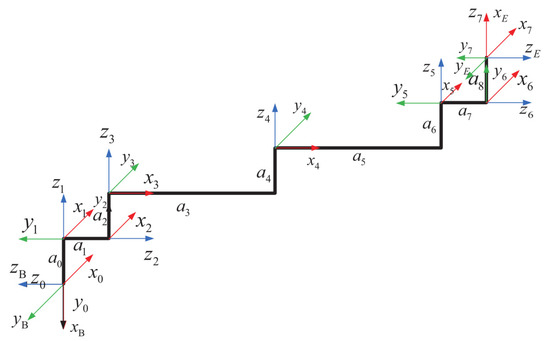 Before conducting simulation experiments, it is necessary to build a kinematic model of the space manipulator with geometric errors. This model is capable of simulating the state of the space manipulator following launch and transfers to the space station, as is shown in Figure 4.