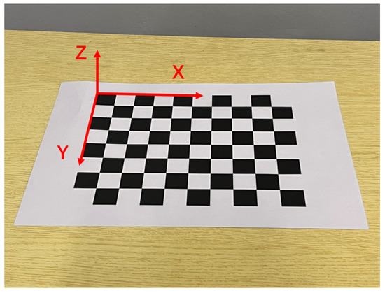 Equation (10) defines the mapping connection between 2D coordinates in the calibration board pictures and 3D coordinates in Cartesian space, while Figure 3 depicts a calibration board. The coordinate of a 2D point in the calibration board pictures is denoted by m,. The origin of the Cartesian spatial coordinate system is fixed in the upper left corner of the calibrated board, and the calibration board plane is used as the XOY plane, with the x axis and y axis parallel to the edges of the checkerboard grid, respectively. The coordinate of a point in the Cartesian space is denoted by ,. In Equation (10), s is an arbitrary scale factor, and we use to denote the augmented vector by adding 1 as the last element: and , and R and t denotes the extrinsic parameters of rotation and translation which relate the world coordinate system to the camera coordinate system. A is the camera intrinsic matrix,