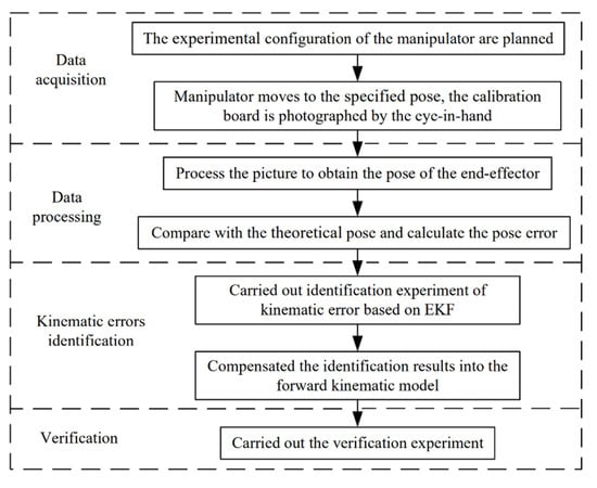 3. Joint error identification: The EKF is utilized to detect the error of the manipulator joint parameters based on the end-effector position error corresponding to the experimental configuration of the manipulator.