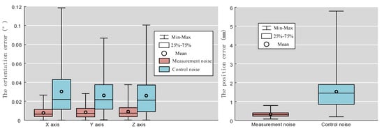 In order to evaluate the impact of measurement error R and control error Q on the positioning accuracy of the end-effector, we first carried out the kinematic simulation of the manipulator with two kinds of noise. Under the condition of no kinematic parameter error, the measurement error and control error are added, respectively to calculate the error of the end pose of the manipulator. With reference to [42] and combined with the design index of the space manipulator, the control noise Q and the measurement noise R are both Gaussian distributed. The average value of Q is set as 0 with the standard deviation of 0.01°. The average value of the position measurement noise is set as 0 with the standard deviation of 0.3 mm. The average value of the orientation measurement noise is set to 0 with the standard deviation of 0.5°. Figure 6 shows the pose errors of 50 groups of simulations after Q and R were added into the forward kinematics, respectively.