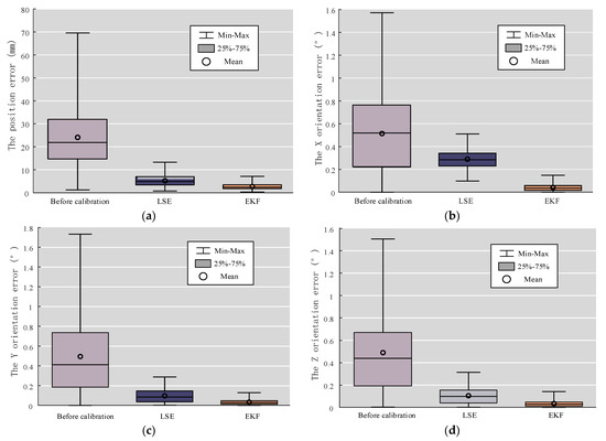 The height of the 25–75% data box in the box plot is called the interquartile range (IQR), which can reflect the degree of data concentration. The more concentrated the data are, the lower the height of the data box is. The IQR of the EKF calibration is less than the IQR of the LSE findings, as shown in Figure 7. This indicates that the distribution of the pose errors is more concentrated after EKF calibration. Additionally, the IQR of the EKF-calibrated manipulator is lower than the LSE-calibrated manipulator. This indicates that the EKF has better calibration in terms of both position and orientation. Compared to the LSE, the EKF results fluctuate less and the calibration result is more consistent. According to Table 4, the calibration effect of the LSE for position and orientation correction varies substantially. The optimization ratio of the X axis orientation is lower by approximately 10% than the Y axis orientation and the Z axis orientation. The EKF optimization ratio of the position and orientation is almost 90%, and the performance of accuracy improvement after calibration is extremely visible. The EKF calibration effect is not only superior to the LSE in terms of total data, but it also has a stable optimization effect in terms of position and orientation.
