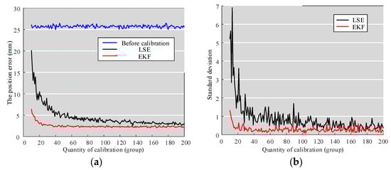 Calibration effect with different numbers of experimental configurations. (a) change in the position error; and (b) change in the standard deviation.
