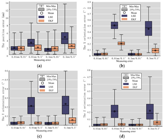 Comparison of the recognition effect of LSE and EKF. (a) Change in the position error; (b) Change in the X axis orientation error; (c) Change in the Y axis orientation error; and (d) Change in the Z axis orientation error.
