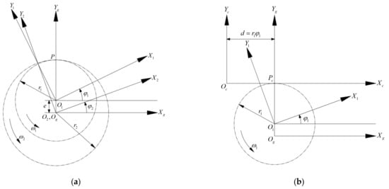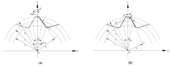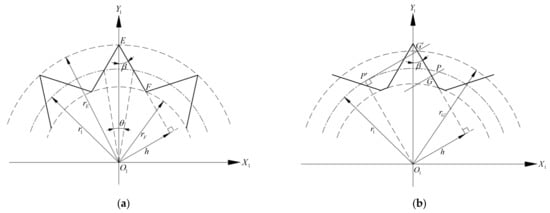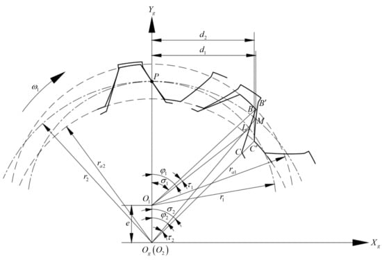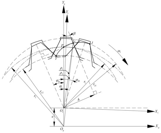 In the coordinate , the conjugate tooth profiles on the right are still taken as an example. The initial meshing position is located at pitch point . At this time, the included angles between the radius of the tooth apexes and of the gear pair and the axis are and , respectively. The following can be obtained from the geometric relationship in Figure 13: