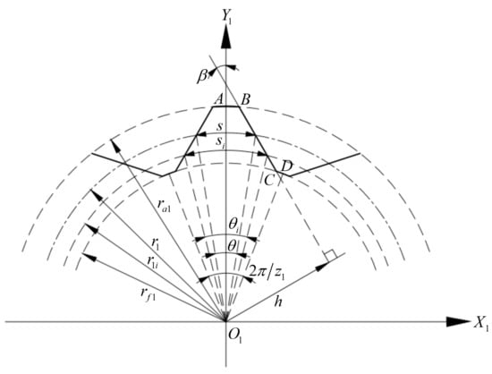 The tooth profile of the external gear in coordinate is shown in Figure 2. The axis coincides with the center line of the gear tooth and the left and right tooth profiles are completely symmetric; therefore, the right tooth profile is modeled mathematically, and then the left can be obtained according to the symmetry relationship. The right tooth profile is composed of three parts: the arc of the addendum circle, the straight-line segment , and the arc of the dedendum circle []. Among them, point is located on the axis and point is located on the symmetric center line of the tooth groove of the adjacent gear teeth. Then the mathematical model of the right tooth profile can be expressed by Equations (6)–(8) []: